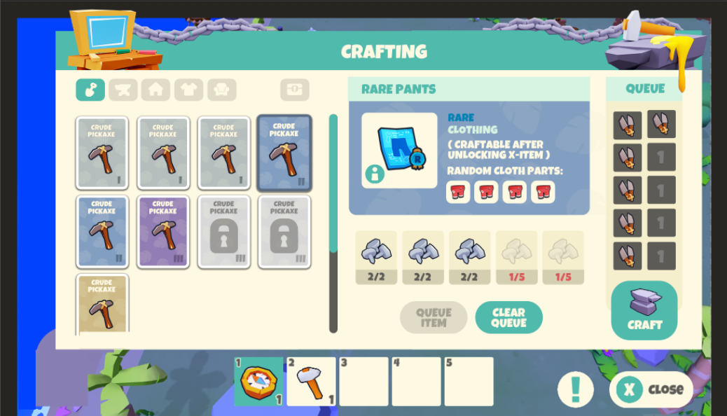Crafting allows players to use materials gathered through foraging, collecting, or farming to create tools, appliances, or decorative items. These crafted items can be used personally, exchanged for resources with NPC Traders, or traded with other players at the Auction Hall.